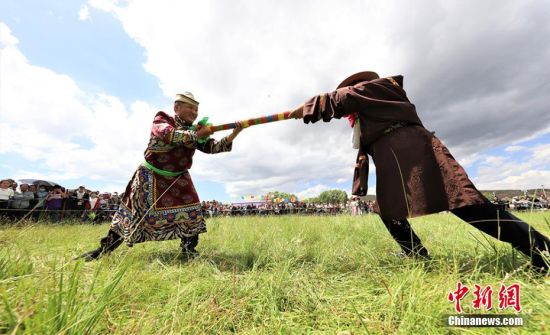 8月8日,甘肅張掖市肅南裕固族自治縣皇城鎮(zhèn)第十六屆民族文化旅游藝術(shù)節(jié)暨傳統(tǒng)體育運(yùn)動(dòng)會(huì)拉開帷幕。賽馬、押加、拔棍、頂杠子、射箭、背垛子等一項(xiàng)項(xiàng)少數(shù)民族傳統(tǒng)體育運(yùn)動(dòng)項(xiàng)目,吸引上萬觀眾觀看。近年來,肅南縣將體育項(xiàng)目與歷史、民族、文化、旅游有機(jī)結(jié)合,打造民族體育節(jié)慶品牌和運(yùn)動(dòng)會(huì),使民族傳統(tǒng)體育發(fā)展增加了新的內(nèi)涵,逐步形成了全民健身品牌,影響力不斷擴(kuò)大。圖為參賽選手進(jìn)行拔棍項(xiàng)目比賽。 趙琳 攝