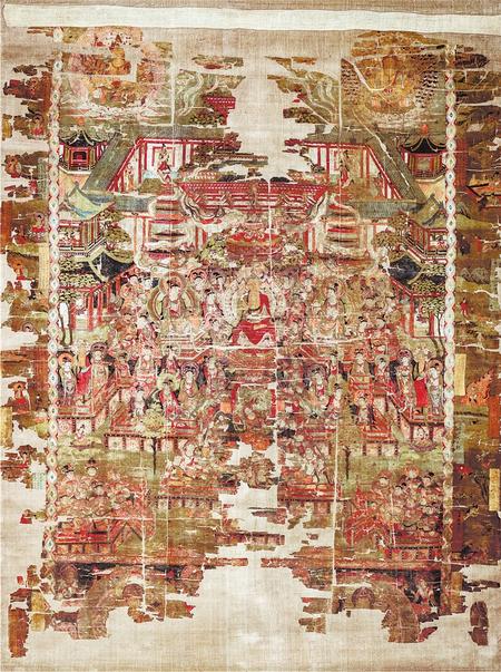 與西方凈土阿彌陀相應(yīng)的是藥師如來的東方凈土,藥師信仰曾在敦煌地區(qū)極為流行。本圖可能是存世敦煌絹畫中最大的一幅,在構(gòu)圖方面可與敦煌石窟壁畫中最復雜的凈土圖相媲美,是敦煌繪畫中十分罕見的超大型絹畫。