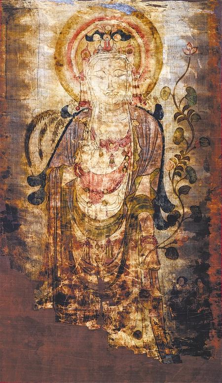 此像雖然褪色嚴重,殘缺不全,卻是敦煌絹畫中極為精美的佳作。觀音菩薩面朝前方,腰肢微扭,左肩前傾。面部輪廓清晰雅致,大耳垂肩,雙目微斂,神態(tài)慈悲安詳。右手持柳枝,左手提凈瓶,彎曲的長莖從瓶口伸出,蓮莖與觀音的站姿相呼應(yīng),搖曳向上在左肩上方開出一朵含苞紅蓮。畫面右下方跪有持蓮花女供養(yǎng)人像二身,她們衣著發(fā)型簡樸。其邊緣和畫面下部缺損嚴重,上部和兩側(cè)保存較完整,左上角長方形榜題呈空白。整幅畫面造型柔美繁復、勾勒緊勁嚴謹,衣帶翻轉(zhuǎn)飄舞,線條行云流水,疏密有致,加之斑斕的色彩,令畫面熠熠生輝。