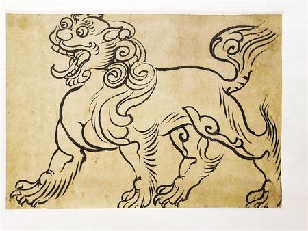 中國本無獅子,原產(chǎn)地是非洲和南美洲,約在漢武帝時才經(jīng)西域傳入。獅子作為進獻的禮物,是敦煌壁畫中最早出現(xiàn)的動物形象之一。由于它的勇猛威儀備受佛教推崇,故在造像和壁畫中曾出現(xiàn)大量的獅子元素。除此,獅子形象還被吸納成為陵墓裝飾和傳統(tǒng)建筑的基本元素。這幅紙本畫,造型準確、健壯飽滿,昂首闊步、氣宇軒昂,線條遒勁、中鋒用筆,彈性十足,顯示出畫家嫻熟的造型功底,長短弧線勾勒卷毛,寥寥數(shù)筆,卻靈動活潑、灑脫不羈,為不可多得之線描精品。