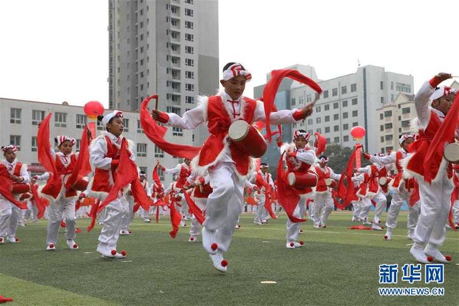 11月4日,蘭州市桃樹坪小學(xué)學(xué)生在活動現(xiàn)場表演歡慶腰鼓。當(dāng)日,甘肅省蘭州市城關(guān)區(qū)學(xué)校體育“一校一品”現(xiàn)場展示活動在蘭州市第五十四中學(xué)舉行,16所學(xué)校進(jìn)行了特色校園體育項(xiàng)目表演。據(jù)介紹,蘭州市城關(guān)區(qū)現(xiàn)已推廣各類體育項(xiàng)目40余項(xiàng),命名“體育特色項(xiàng)目示范校”42所。 新華社記者 張智敏 攝