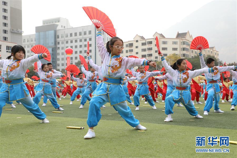 11月4日,蘭州市寧興小學(xué)學(xué)生在活動現(xiàn)場表演武術(shù)操。新華社記者 張智敏 攝