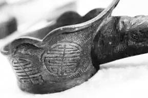 讓我們先看看這個(gè)熨斗:這是一件漢代家庭使用的生活工具,從外形來(lái)看,它通長(zhǎng)28厘米,柄長(zhǎng)16厘米,勺徑12厘米。柄、勺分別鑄造后焊接而成,勺圓口,寬折沿,微侈,圓腹,圓底,外沿下一圈弦邊。沿下焊柄,柄呈平面,圓底條狀,柄首呈張口龍頭形,勺內(nèi)有黑色炭跡。這是兩千年前漢代人使用時(shí)留下來(lái)的痕跡。在勺的外側(cè),還有一塊類似銘文的東西。