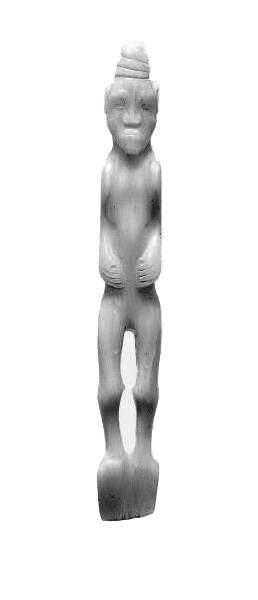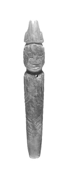 另一件出土于白草坡2號(hào)墓的玉人則有所不同,高7.9厘米,黃綠色玉,立像,無足。頭戴高冠,廣額巨目,身似著袍服,身體下方三分之二處有四條刻紋,似被捆綁四肢狀,胸部有一穿孔,或可佩戴。這個(gè)玉人和玉人形鏟有關(guān)系嗎?摘掉頭上戴的高冠,會(huì)不會(huì)也盤有虎首蛇身發(fā)髻?我們無從得知。