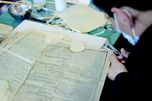 古籍部主任李東暉介紹,古籍破損的原因很多,歸納起來(lái)大致有蟲(chóng)蛀鼠嚙、霉蝕、酸化、老化、使用中的磨損等。針對(duì)不同的“病因”,古籍修復(fù)師都要制訂不同的修補(bǔ)方案。古籍修復(fù)有兩種方法,一種是全手工修復(fù),另一種是使用紙漿補(bǔ)孔設(shè)備修復(fù)。全手工修復(fù)需要選擇配紙、修補(bǔ)破洞、壓平處理、搓紙捻釘、理齊、打眼、復(fù)原裝訂成冊(cè)等工序。紙漿補(bǔ)孔機(jī)修復(fù)一般適用于蟲(chóng)蛀破損嚴(yán)重的古籍。面對(duì)一些破損嚴(yán)重的古籍,將粘連的古籍分頁(yè)也絕非易事,得使用“干揭”“濕揭”“蒸揭”等手法。