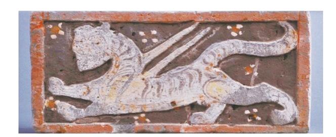 通過(guò)彩繪磚可見(jiàn),這只白虎昂首,張口作怒嘯狀,雙翼挺出,身飾虎斑紋,曲尾上揚(yáng),四肢騰躍。四周點(diǎn)綴四瓣白葉花,花心點(diǎn)橘紅色。