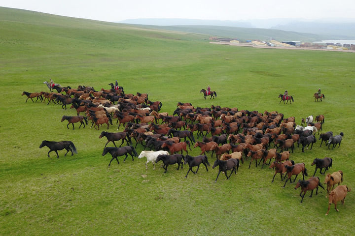2021年6月19日,駿馬在山丹馬場奔跑(無人機照片)。新華社記者 范培珅 攝