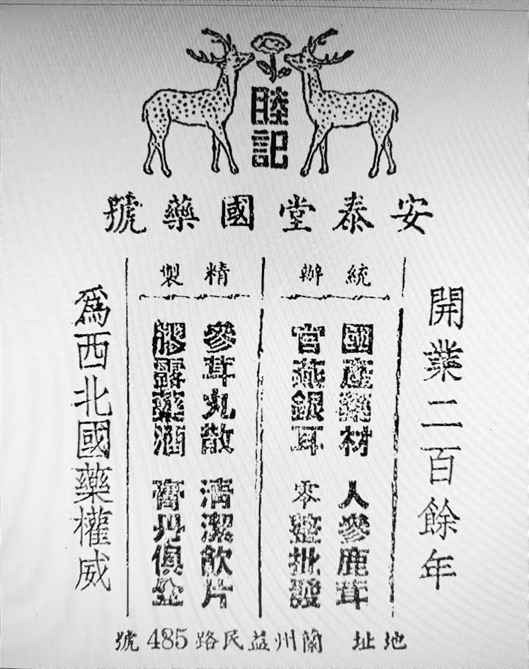 安泰堂作為百年老店,其廣告詞自然頗具氣場。首先明確定位:“開業(yè)二百余年、為西北國藥權威”,其次是統(tǒng)辦“國產(chǎn)藥材、人參鹿茸,官燕銀耳、零整批發(fā)”,最后是本店特色,精制“參茸丸散、清潔飲片,膠露藥酒、膏丹俱全”。