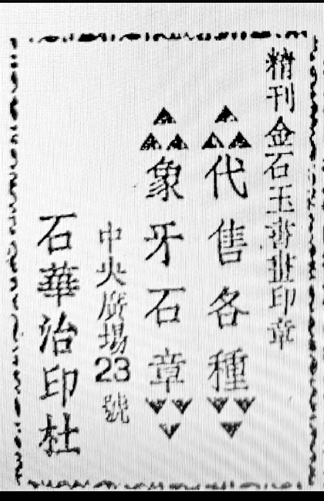 最后要提到的一則廣告也與文化有關。蘭州和平日報社1947年出版的《新蘭州》一書中,曾刊登石華治印社廣告,其廣告詞曰:“精刊金石玉書畫印章、代售各種象牙石章”,社址在中央廣場23號,其創(chuàng)辦者即為隴右印壇名宿駱石華先生。駱石華先生1920年生人,彼時未及而立,尚未入白石先生門下;筆者家外祖解放前供職中央廣場郵局,當年曾與石華先生相交。今偶于舊籍中覓得石華治印社當年廣告,恭錄于此,既為本文收尾,亦為家外祖與石華先生半個世紀友誼之緬懷。