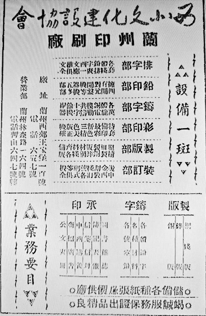 個別有實力的印刷廠也通過廣告拓展業(yè)務。如創(chuàng)辦于1947年9月的西北文化建設協(xié)會蘭州印刷廠是當時甘肅規(guī)模較大的印刷廠之一,曾印制過《蘭州古今注》《花兒集》《西北論叢》《新光》等書刊。據(jù)當年廣告所載,該廠內設排字部、鉛印部、鑄字部、彩印部、制版部、裝訂部,承印范圍亦頗廣,包括圖書雜志、傳記表報、信箋信封、中西講義、商標廣告、公文表格等。