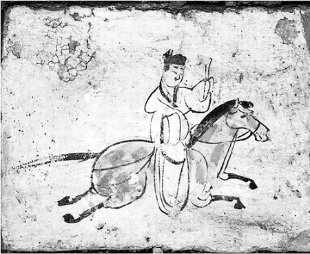 這一時期,自天子以至百官士庶,除乘車外還普遍騎馬。西晉時北方出現(xiàn)上馬時所踩的單馬鐙,南北朝后期又出現(xiàn)嚴(yán)格意義上的雙馬鐙。馬鐙的使用能減輕人們騎馬的體力消耗,有利于控制馬匹。這一時代的低級官員和百姓出行還乘驢、騾,甘肅等西北地區(qū)少數(shù)民族多乘駝,運載貨物主要用牛車。漢地民眾出行,仍然是安步當(dāng)車。嘉峪關(guān)魏晉墓五號墓的《驛使圖》,畫面中一個郵驛使騎在馬上,頭戴進(jìn)賢冠,身穿右襟寬袖衣,足蹬長靴,左手舉木牘文書,右手持馬韁,驛騎四蹄騰空,飛奔直前。這幅畫再現(xiàn)了當(dāng)時甘肅地區(qū)驛使馳送文書的情景,也是我國古代郵驛使較早的形象資料。