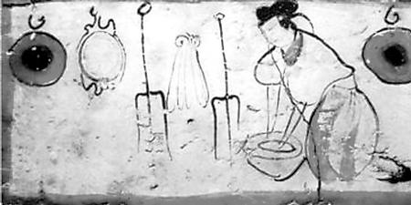 糧食、蔬菜品種與前代相比沒有大的變化,仍是漢地人的主要經(jīng)濟(jì)和衣食來源。烹飪方法,這一時期出現(xiàn)了面粉發(fā)酵技術(shù)。北魏賈思勰介紹發(fā)面技術(shù)說:“面一石,白米七八升作粥,以白酒六七升酵中,著火上,酒魚眼沸,絞去滓,以和面,面起可作”(《齊民要術(shù)》卷9)。把北魏時期的容量數(shù)換算成今天的市斤,上段話的意思就是,用五十多斤面粉,五六斤白米做粥,再用四五斤白酒(甜米酒)做酵母,將酒架火上燒至發(fā)出魚眼樣的小泡后,濾去酒渣,加入面粥中發(fā)酵,等面發(fā)起后就可以做餅了。這是一項歷史性的烹飪技術(shù)。從發(fā)面的數(shù)量看,一次發(fā)這樣多面的家庭,至少有三五十口人,顯然是當(dāng)時世家大族的人口規(guī)模。世族如此,普通民眾也應(yīng)很快就學(xué)習(xí)掌握了發(fā)面技術(shù)。