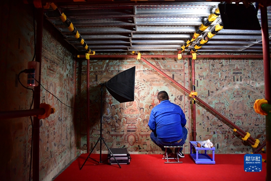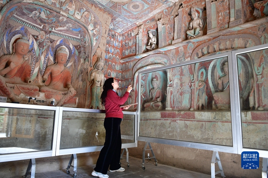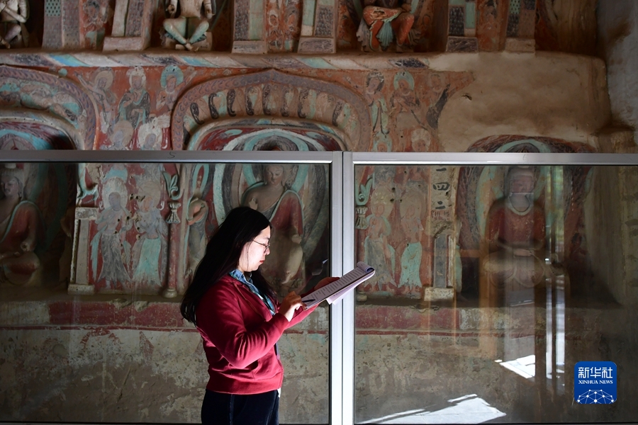 4月19日,王嬌在莫高窟第259窟做洞窟記錄。新華社記者 陳斌 攝