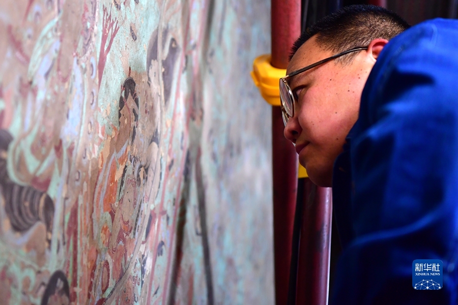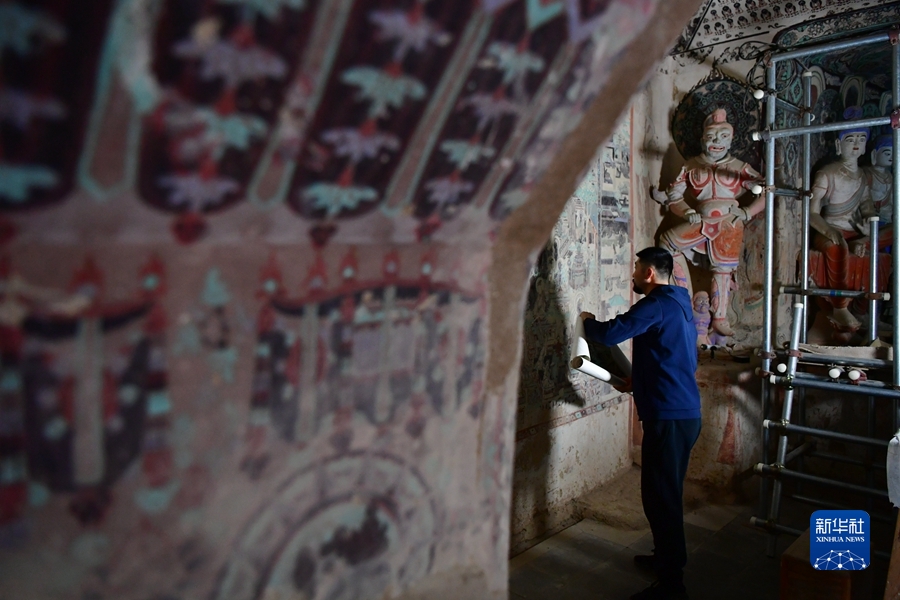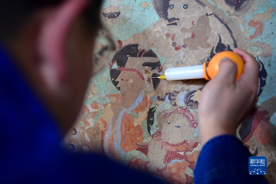 4月19日,在莫高窟第231窟,楊金禮在修復(fù)出現(xiàn)病害的壁畫(huà)。新華社記者 杜哲宇 攝