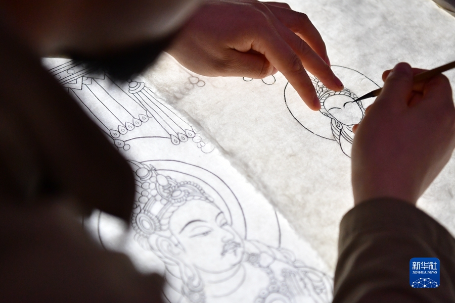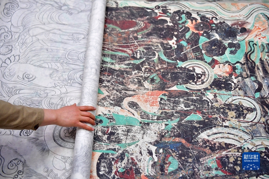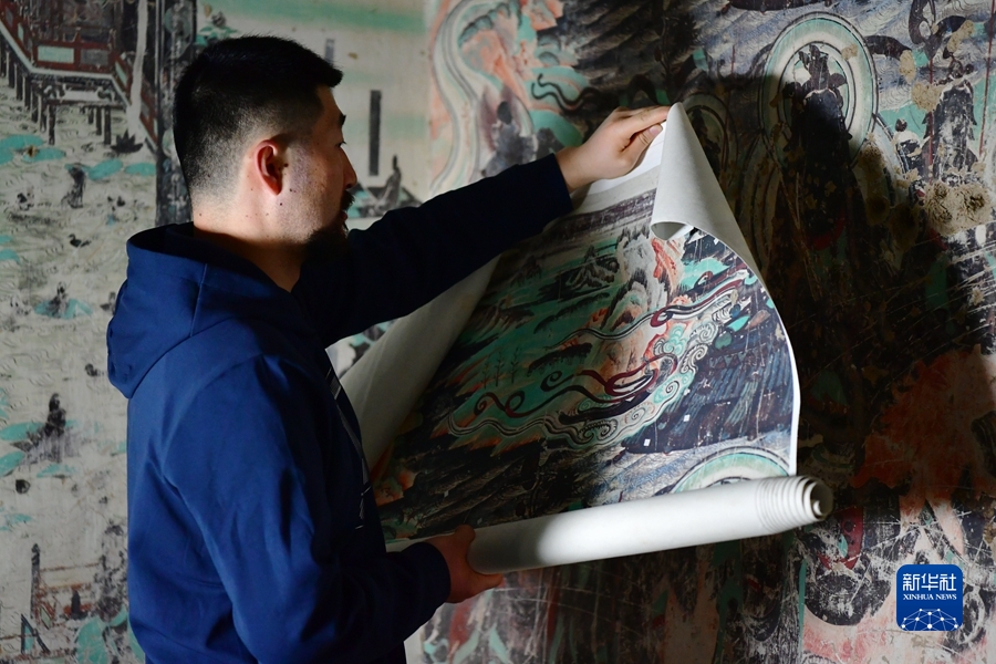 4月19日,在莫高窟第172窟,劉小同在對(duì)比臨摹壁畫(huà)的細(xì)節(jié)。新華社記者 杜哲宇 攝
