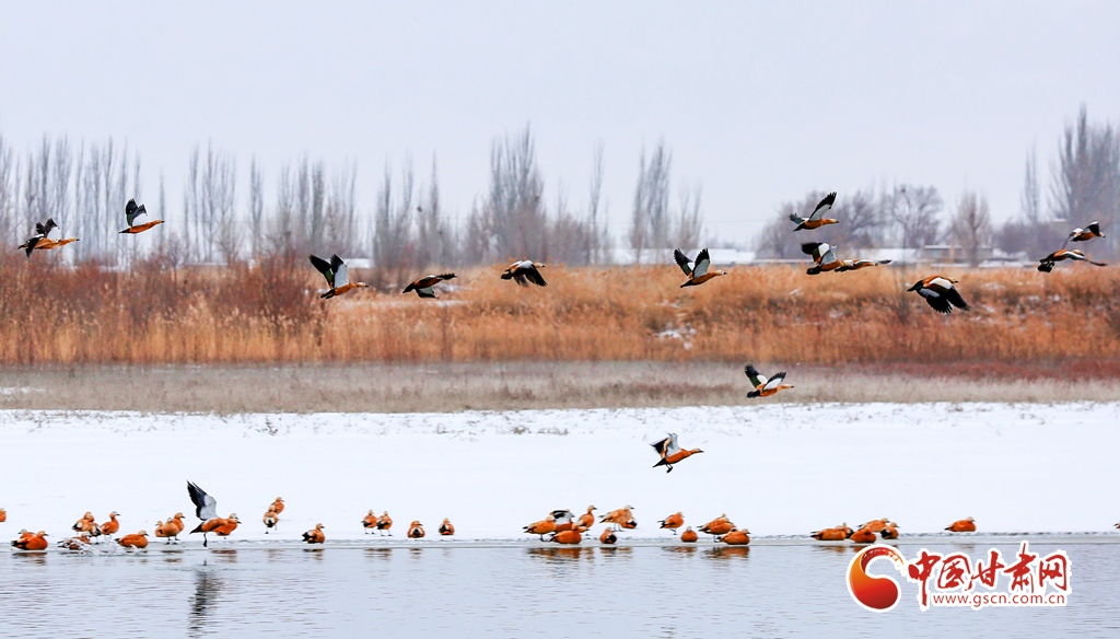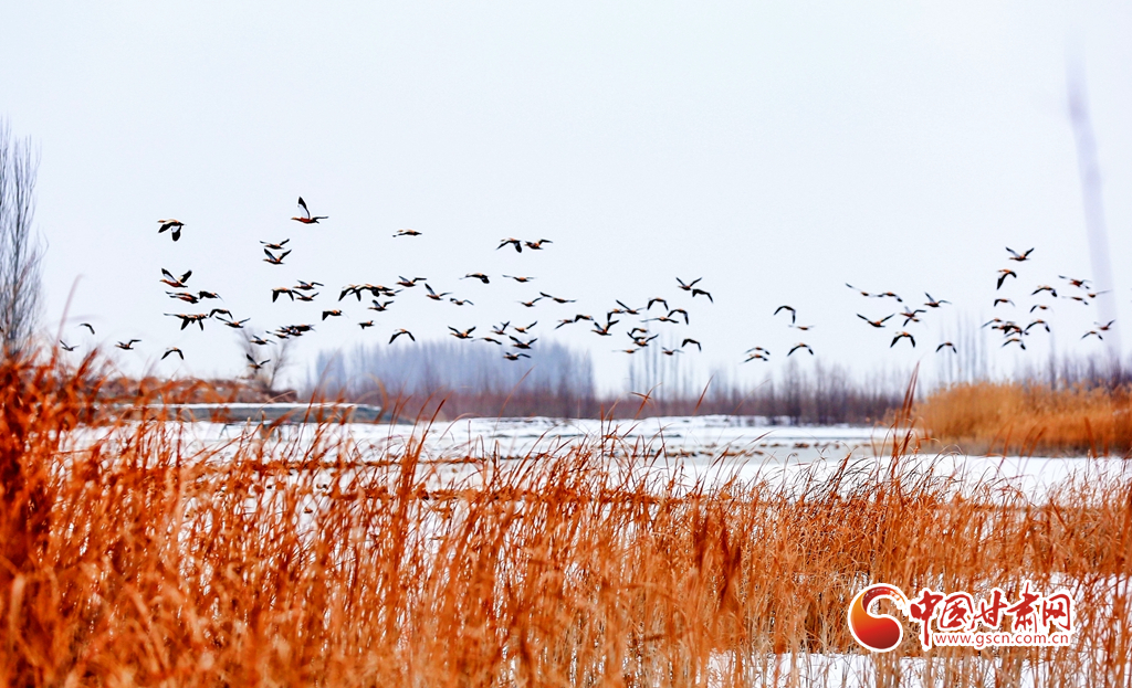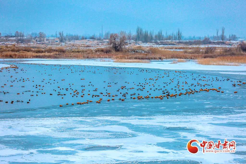 12月20日,在甘肅省酒泉市銀達(dá)鎮(zhèn)花園水庫(kù),一群候鳥(niǎo)正在戲水、覓食,為祁連山下的戈壁大地增添了一道亮麗的景色。