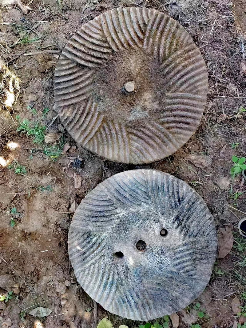 家鄉(xiāng)人有這樣一個風俗:謂石磨為“白虎”。宅外可任意安置使用,若宅內(nèi)安置,必請推算具體固定方位安置,方可趨吉避兇。因而每當“上茬”新磨時,人們都要燒香叩首,在提前修好的磨盤上貼一幅“白虎臥之大吉”之類的條幅,祈求“鎮(zhèn)宅避邪,消災降福”,求得全家幸福安康。一切準備就緒后,石匠開始對上下磨扇進行劃線。     歷代石匠,大多目不識丁,幾無量角器的概念和意識,但能嫻熟地將石磨的圓周九等分。在九個扇面中,又隨形由大到小的用扇形弧將每個扇面布滿,其中81條弧就是“磨齒”。分好以后,搬來一條凳子,坐在上面,錘敲釬響,順線游走,由淺及深,“叮叮當當”,響聲不斷,儼然一個寒江垂釣的老者。錘子和鋼釬敲打出的音符,抑揚頓挫,蕩漾在農(nóng)家院里。上下兩扇磨齒和溝槽鑿好后,石匠找出磨盤的中心點,鑿出圓孔,鑲嵌上凹凸軸,將兩扇磨合到一起,從上扇孔里加進一點糧食研磨一番。如有不妥,重新修齒,直到完全能用方可。