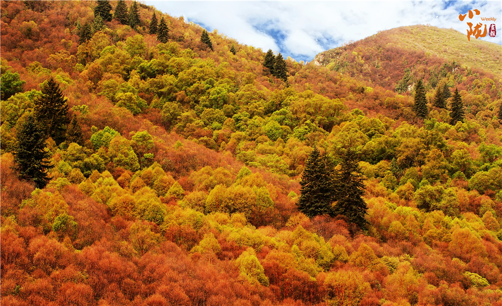 各種樹木依山勢(shì)成層密布,在金秋時(shí)節(jié)似浪花翻涌,山色隨著季相的變化依次呈現(xiàn)橙紅、嫩綠、碧黛和金黃,可謂層林盡染。