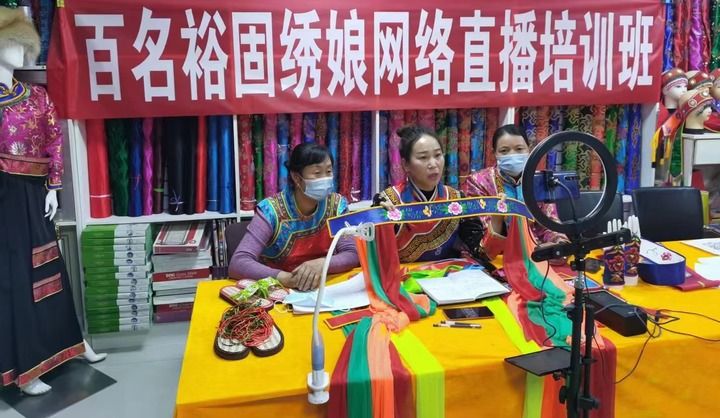 2021年11月,獲得甘肅省鄉(xiāng)村工匠名師稱號的潘小紅(中)帶領姐妹通過網(wǎng)絡直播幫助更多人學習刺繡技巧。新華社發(fā)(佘萬青攝)