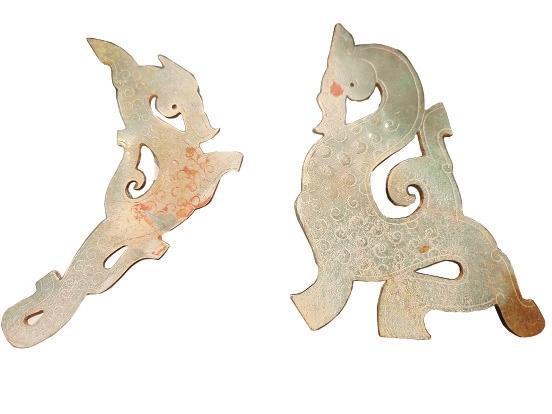 這對戰(zhàn)國谷紋玉龍,一個(gè)完整,一個(gè)略有殘缺。春秋戰(zhàn)國的龍,龍身很長,蜿蜒曲折,一般成對出現(xiàn)。龍身的裝飾,以谷紋或勾云紋為主,造型較多見的有蟠龍、行龍、虬龍、夔龍。戰(zhàn)國的龍身形態(tài)各異,基本上有個(gè)共同特點(diǎn)—“水滴眼”,龍頭多為“連云頭”,廓線出鋒,棱角分明。裝飾上多為陰刻和浮雕工藝。