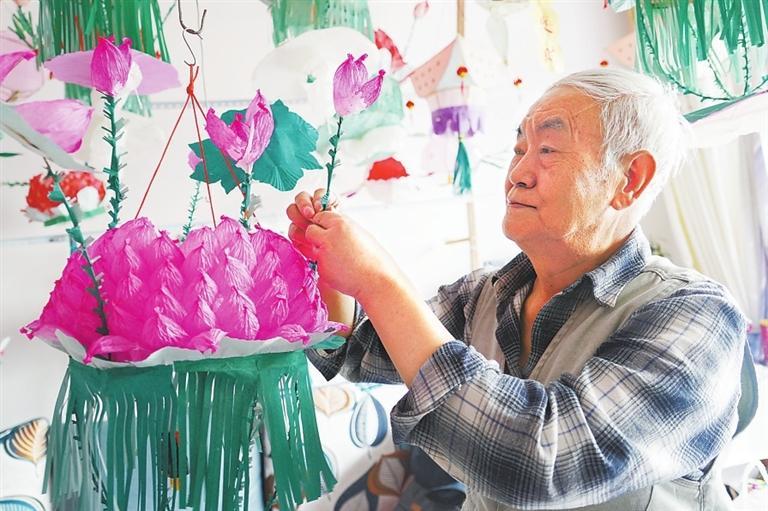 從選擇扎彩燈的竹子、劃竹篾、綁架子、染紙、糊紙、繪畫、貼字到成型完工,全由他自己一個(gè)人完成。