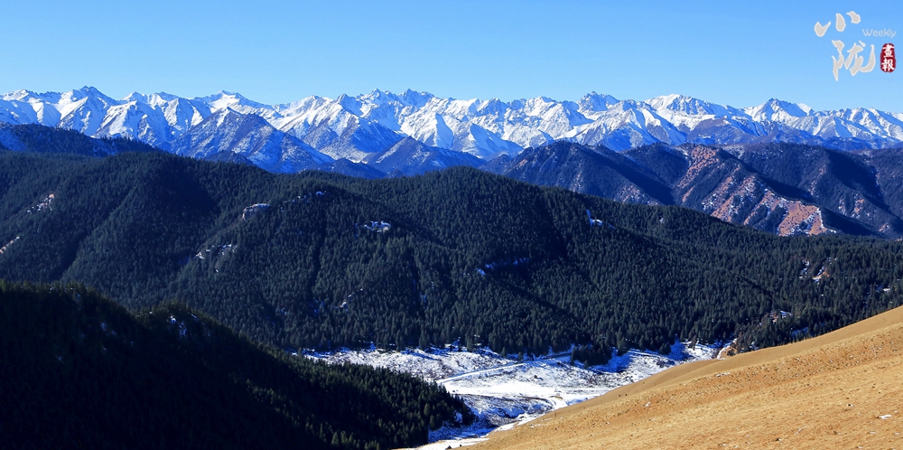祁連主峰在藍(lán)天白云的映襯下顯得肅穆大氣。周?chē)悍辶_列、層巒疊嶂,高低延綿的山脈在陽(yáng)光的照耀下交相輝映,近處的群山被此起彼伏的林海包圍,像一道道五彩的波浪,郁郁蔥蔥,生機(jī)盎然。