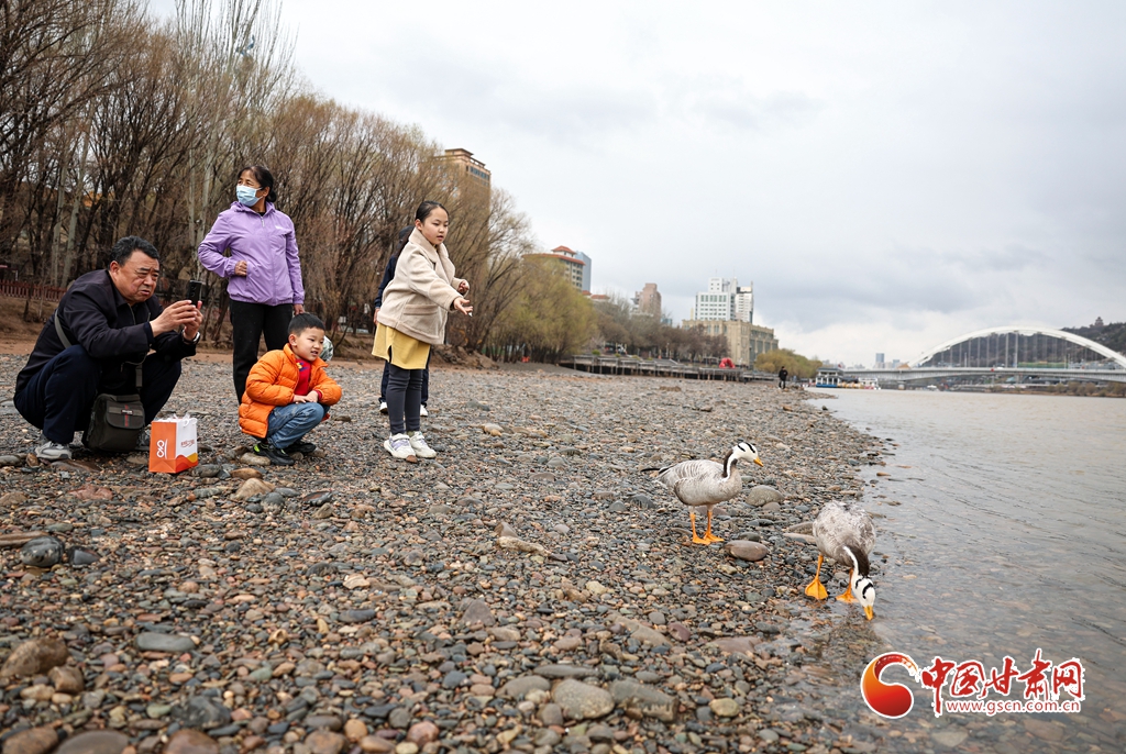 3月24日,在甘肅省蘭州市城關(guān)區(qū)黃河河畔,市民正在給斑頭雁投食、拍照。