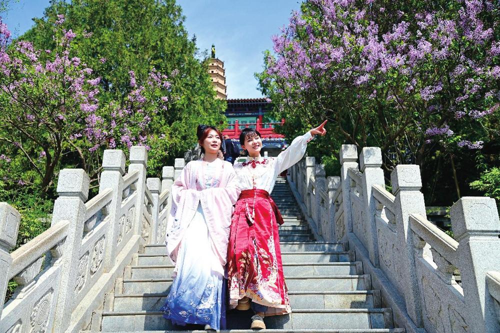 ▲蘭州白塔山下,年輕人著漢服賞花春游成為一道春日新景。