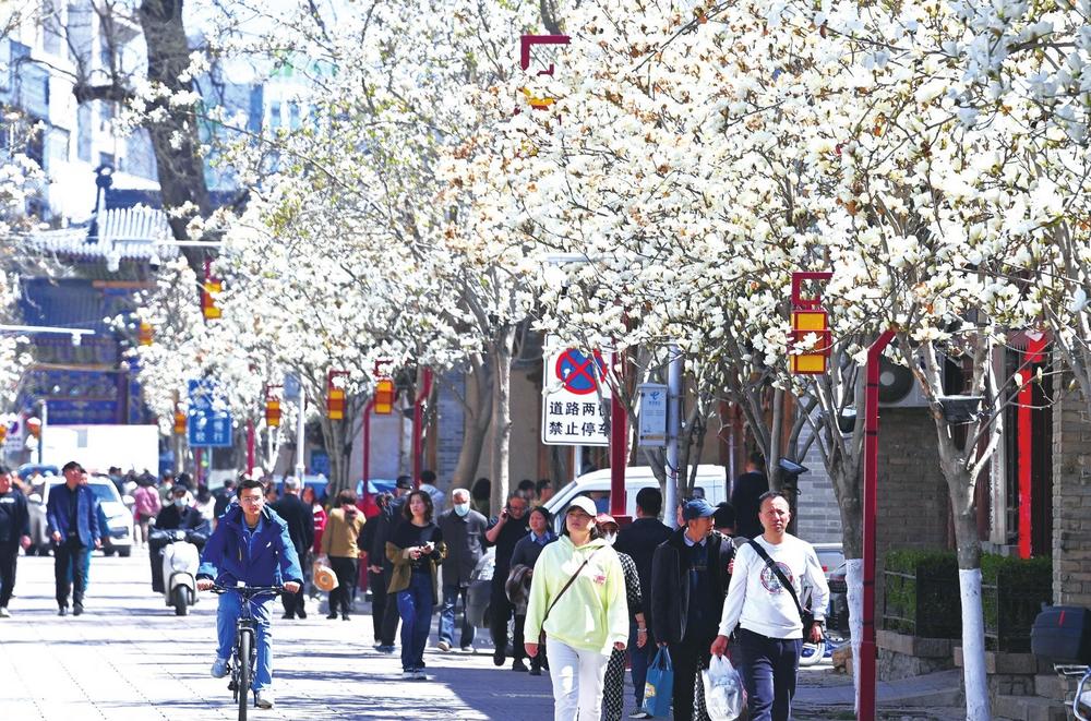 ▲天水秦州古巷里盛開的玉蘭花,讓游客駐足觀賞。