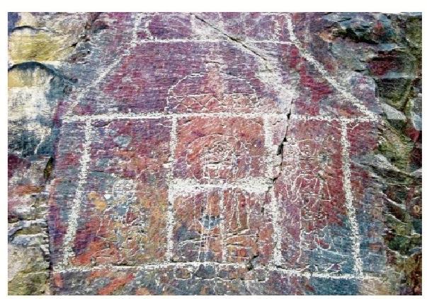黑山巖畫中的晚期巖畫,主要反映宗教文化。紅柳溝、石關(guān)峽口巖畫中的殿堂、佛塔、佛像、古藏文題刻,可能屬于唐代中期以后的宗教遺物。藏傳佛教在 7世紀(jì)時(shí)同古藏文一起為吐蕃松贊干布創(chuàng)立。據(jù)史書記載,唐因平定“安史之亂”,河西空虛,吐蕃乘機(jī)占領(lǐng)河隴之地達(dá) 100 余年。吐蕃人居住河西,在紅柳溝、石關(guān)峽刻畫佛教殿堂、菩薩、佛像、佛塔是完全可能的。由此推斷,黑山紅柳溝、石關(guān)峽口佛塔、佛像及藏文題刻為唐中期以后的吐蕃所留。