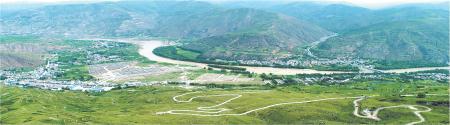 藍天白云之下,廣闊的平地上,綠意盈盈,農(nóng)人在田間忙碌,鋤田薅草,扶苗施肥,裊裊炊風里飄蕩出生活的恬靜與安逸。我放飛無人機,俯瞰鐵城堡故址全貌、周邊的田地和村莊以及靜靜流淌的洮河。