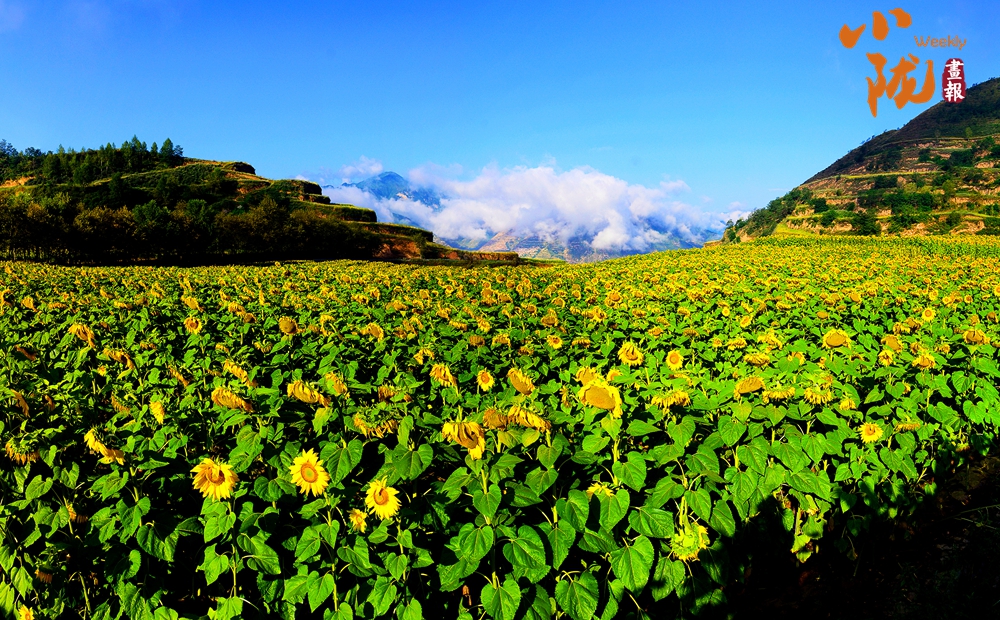 盛開(kāi)的向日葵,迎著朝陽(yáng),競(jìng)相綻放,婀娜多姿,在藍(lán)天白云下,卷起花的浪朵,匯聚成碧波蕩漾、金光閃閃的海洋,讓人心曠神怡。