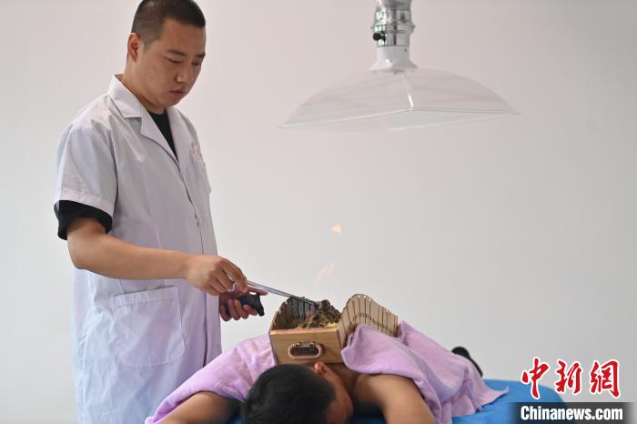 7月16日,甘肅省平?jīng)鍪徐`臺縣皇甫謐針灸康養(yǎng)館內(nèi),工作人員對患者進行拔火罐。2006年,靈臺皇甫謐針灸術(shù)入選第一批甘肅省非物質(zhì)文化遺產(chǎn)名錄。靈臺作為皇甫謐故里,當?shù)孛癖姺浅UJ可中醫(yī)康養(yǎng),針灸、拔火罐、推拿、葫蘆灸、火龍灸(督脈灸)等中醫(yī)特色療法受到了很多人的青睞,當?shù)毓俜揭餐ㄟ^舉辦大型節(jié)會等助推中醫(yī)康養(yǎng)產(chǎn)業(yè)發(fā)展。 皇甫謐是針灸醫(yī)學(xué)鼻祖,其《針灸甲乙經(jīng)》已在多個國家被廣泛傳播應(yīng)用。  中新社記者 李亞龍 攝