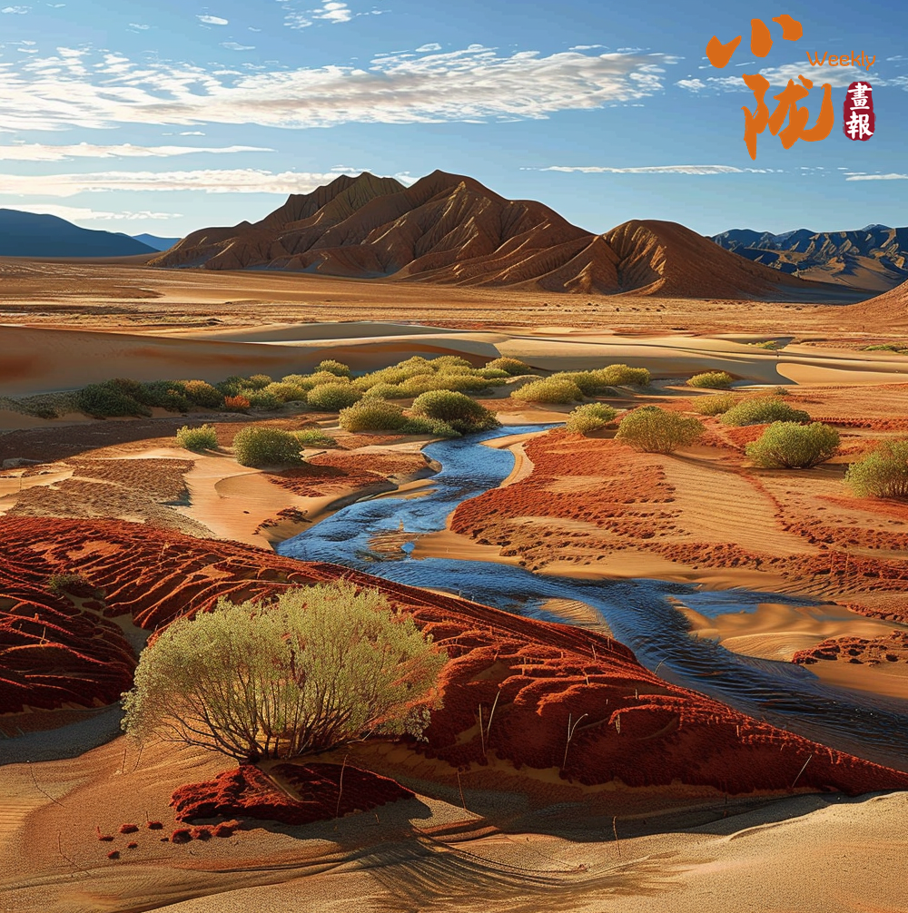 一叢叢紅柳宛如流動(dòng)的彩云,在這蒼茫的戈壁灘上盡情綻放。這種看似平凡卻又充滿生命力的植物,與藍(lán)天白云相映,與沙丘中一蓬蓬的綠色為伍,為這粗狂的戈壁帶來(lái)了無(wú)限生機(jī)。