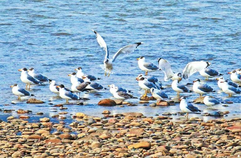 黃河蘭州段成群結隊的漁鷗在水面游弋。田蹊