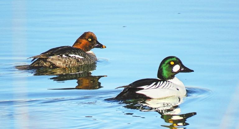 鵲鴨同樣喜好潛水,但主要在追蹤小魚和水生昆蟲。雖然只是中等體型,它卻有個大大的腦袋,仿佛戴了一頂帽子。在雄鴨墨綠色的頭上,明黃色的眼睛前下方生出個白色圓斑,頗顯呆萌。體羽則黑白相間,故得“鵲”名。