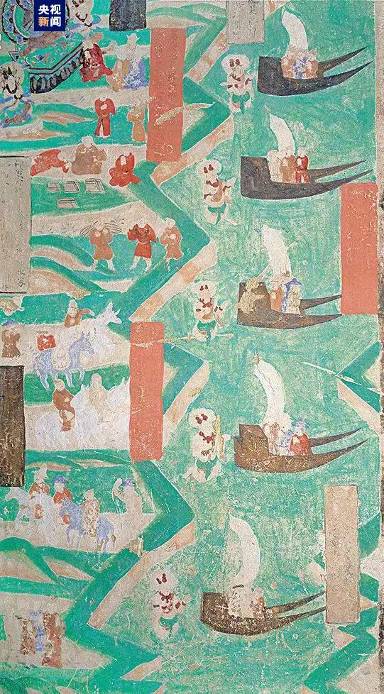 雙尾帆船:五只雙尾帆船方頭平底,尾尖上翹呈燕尾狀,每只船上均坐三人,河岸曲折蜿蜒,岸上行人往來(lái)穿梭,一場(chǎng)盛大的航行正在啟幕。莫高窟第98窟,五代。
