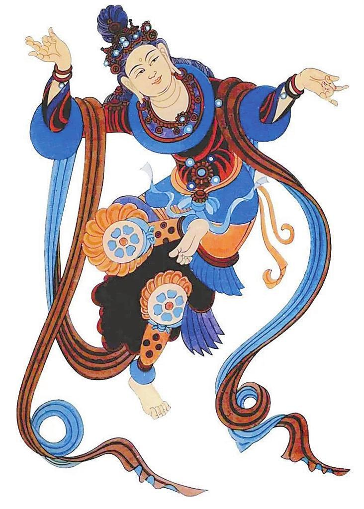 敦煌莫高窟,窟窟有壁畫,拼接起來長達(dá)45000多平方米,有世界上“最大畫廊”之稱。這些壁畫中,幾乎每幅都有舞蹈形象,如在窟頂、龕楣、藻井遨游的飛天,憑欄上的天宮伎樂,經(jīng)變畫中的娛佛、敬佛的獻(xiàn)舞者——伎樂天,出行圖中跳著具有濃郁生活氣息的世俗樂舞,以及富有舞蹈美感的彩塑菩薩、天王力士等,琳瑯滿目,精妙絕倫。這些舞蹈形象充分反映了從十六國北朝至元代千余年來不同歷史時(shí)期的舞蹈服飾、形態(tài)、風(fēng)貌,為我們挖掘、整理、弘揚(yáng)中華民族舞蹈文化提供了十分珍貴的形象資料。
