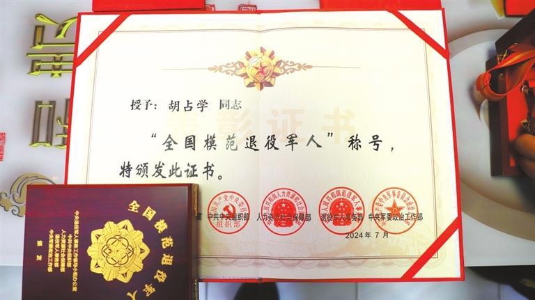 今年8月,胡占學(xué)被人力資源和社會保障部、中共中央組織部、退役軍人事務(wù)部、中央軍委政治工作部等軍地相關(guān)部門聯(lián)合授予“全國模范退役軍人”榮譽稱號,這是對退役軍人的最高榮譽和最大褒獎。