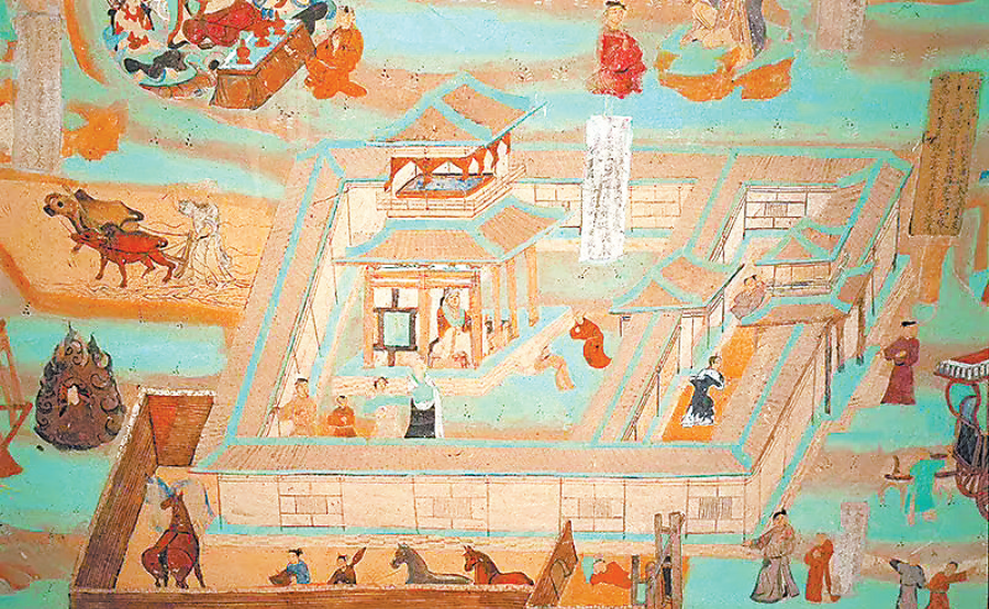 如莫高窟北魏第257窟“須摩提女緣品”圖中宅院的三面就有城垣圍繞,一側(cè)有門(mén)樓,院內(nèi)有堂,堂后有四層望樓,樓后有園,墻頂雙線,代表土墻上加筑的女墻。宅第的墻垣上有突出并高于城垣的墩臺(tái)顯示出城墻的防御功能。