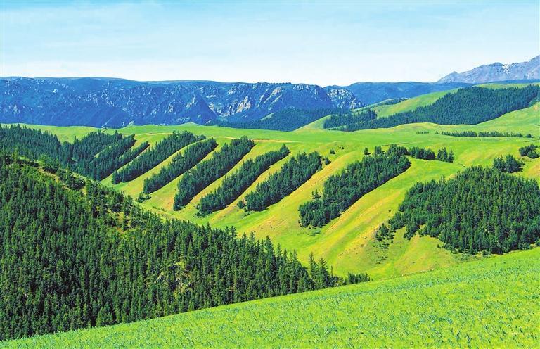 站在山頂一處觀景平臺(tái),放眼四周,滿目蒼翠,層巒疊嶂。祁連云杉環(huán)繞半山腰,山杏、樟子松、沙棘等樹木縱橫成行,微風(fēng)拂過(guò),綠浪涌動(dòng)。
