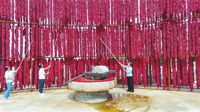 位于甘谷縣安遠(yuǎn)鎮(zhèn)上河灣村的甘肅隴上椒農(nóng)業(yè)科技(集團(tuán))有限公司,工作人員正在晾曬辣椒。新甘肅·甘肅日報(bào)通訊員 王啟寧