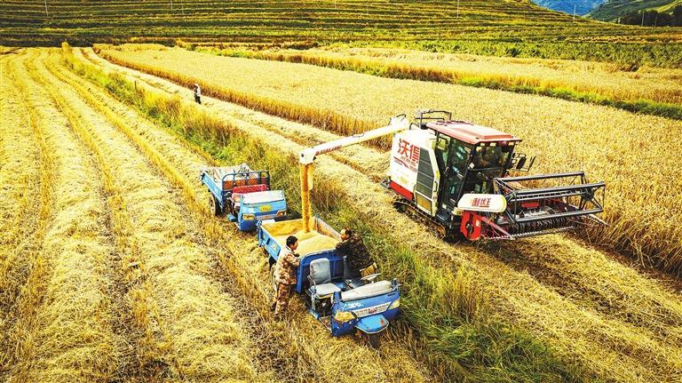 天??h朵什鎮(zhèn)萬畝梯田,農(nóng)機(jī)手駕駛收割機(jī)收割小麥。新甘肅·甘肅日報(bào)通訊員 趙世鵬
