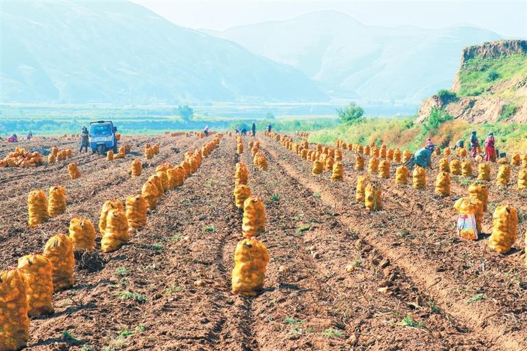 定西市安定區(qū)魯家溝鎮(zhèn)村民在分揀、裝運(yùn)收獲的馬鈴薯。新甘肅·甘肅日報(bào)通訊員 胡耀偉