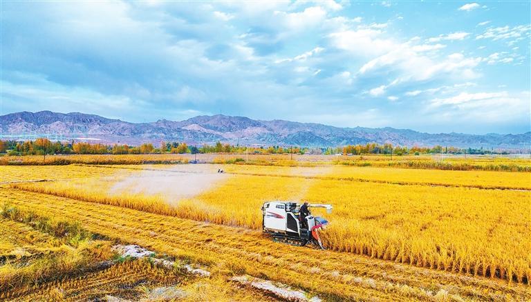 張掖市甘州區(qū)烏江鎮(zhèn)大灣村2000多畝稻田一片金黃,村民正在進(jìn)行搶收作業(yè)。新甘肅·甘肅日報(bào)通訊員 楊瀟
