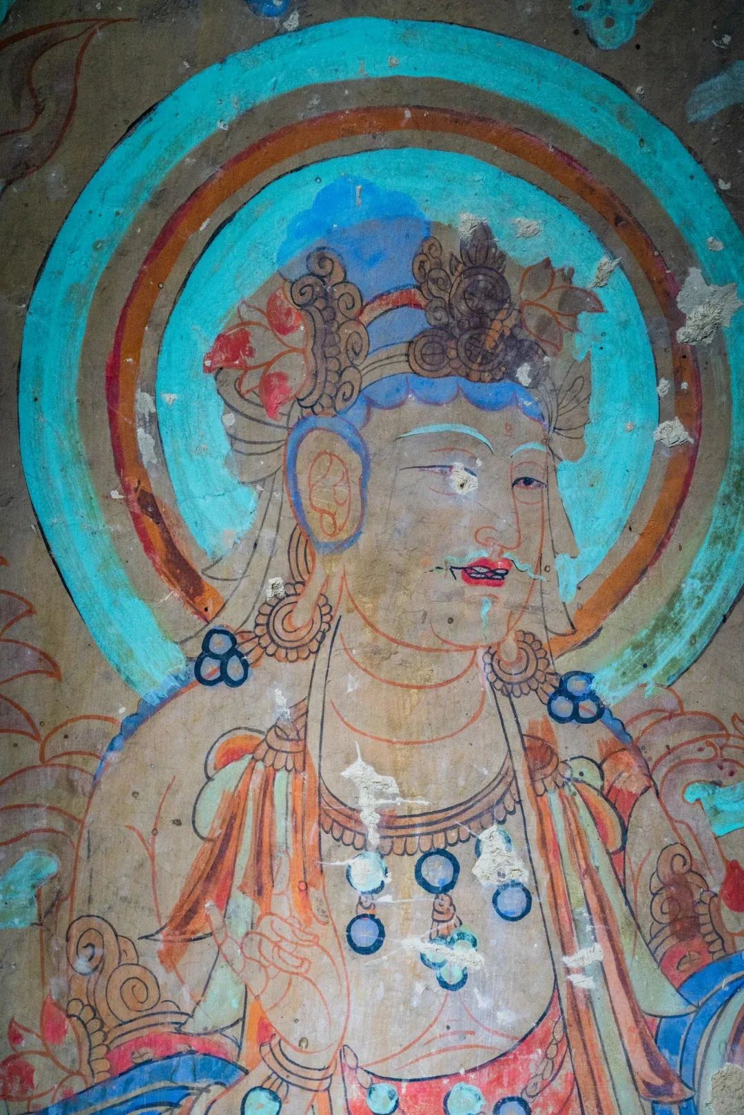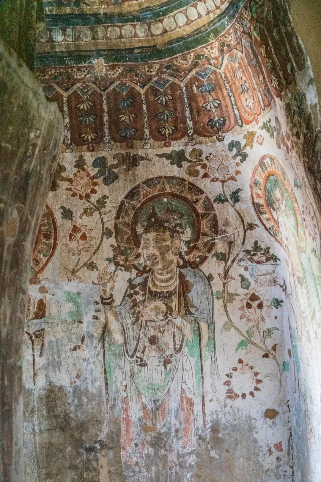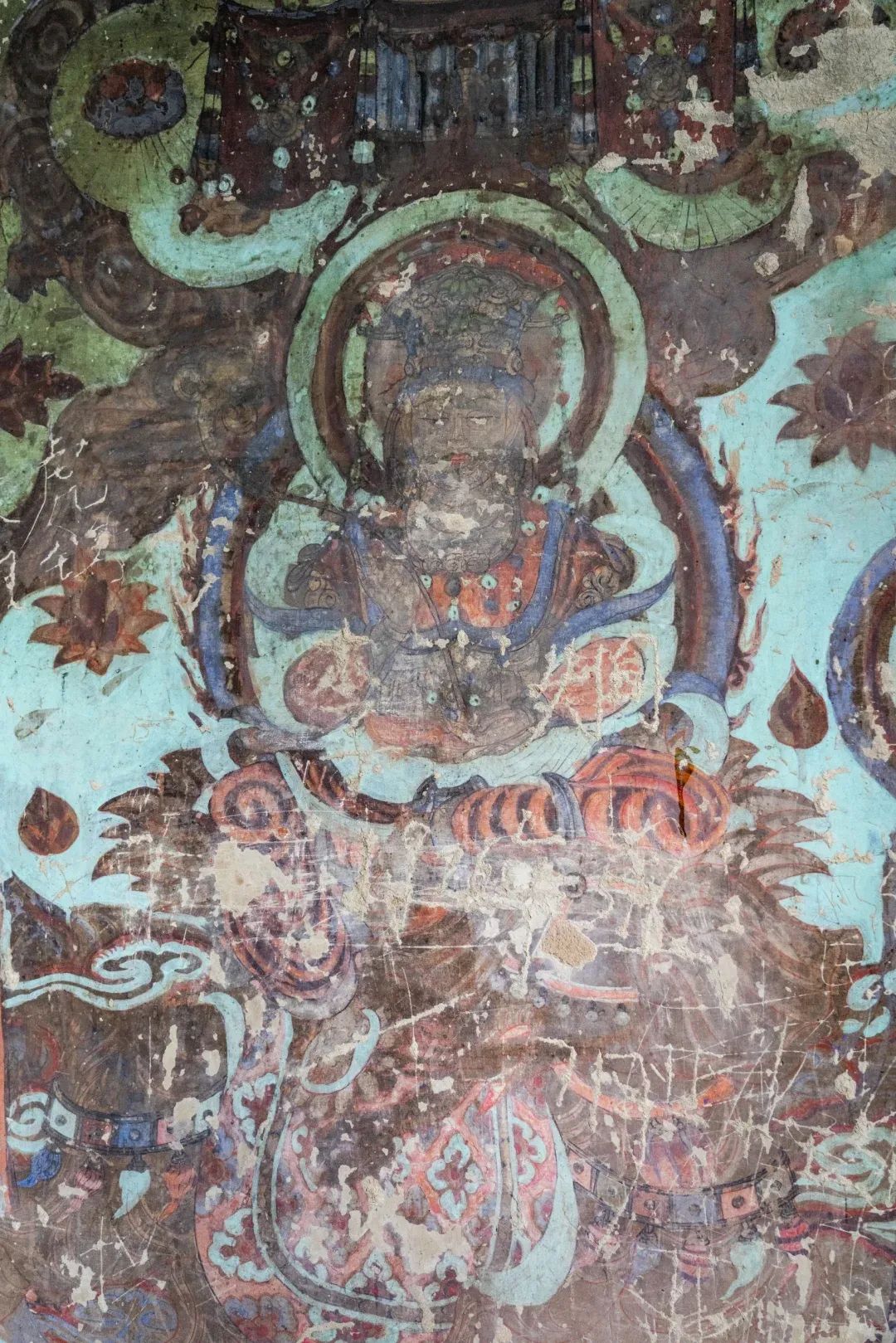 現(xiàn)在第4窟中早期塑像多數(shù)已毀,但仍殘存少數(shù)幾身,十分珍貴;各側(cè)面表層為西夏重修時(shí)繪制的壁畫;柱座與柱身的兩層自下而上逐層縮?。恢行闹嬖谖飨臅r(shí)改造成一橢圓形的大背屏,背屏正面表層為清代重繪的壁畫;四壁及頂上壁畫也多為西夏時(shí)期。