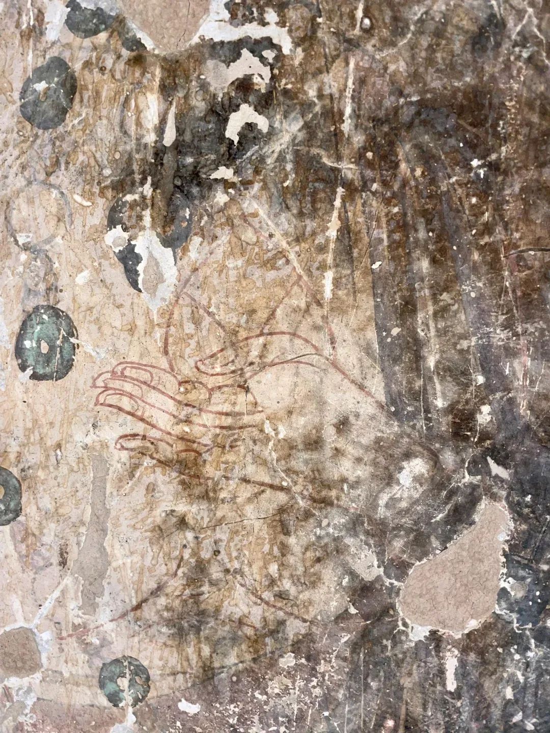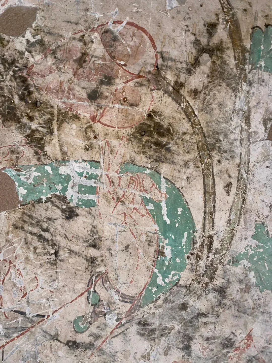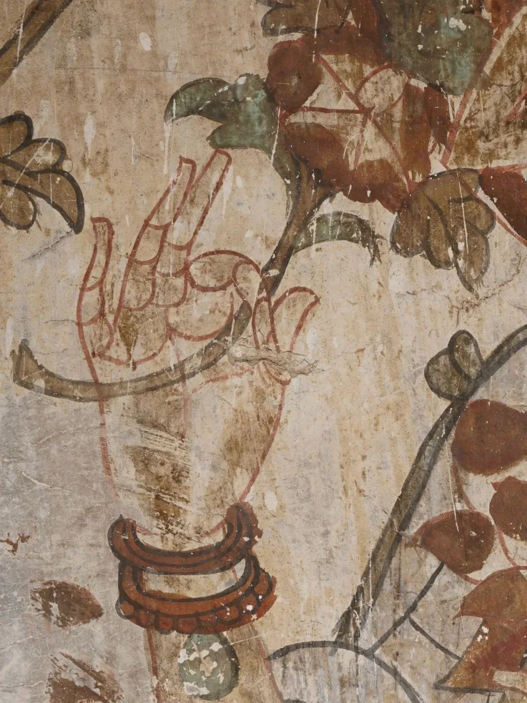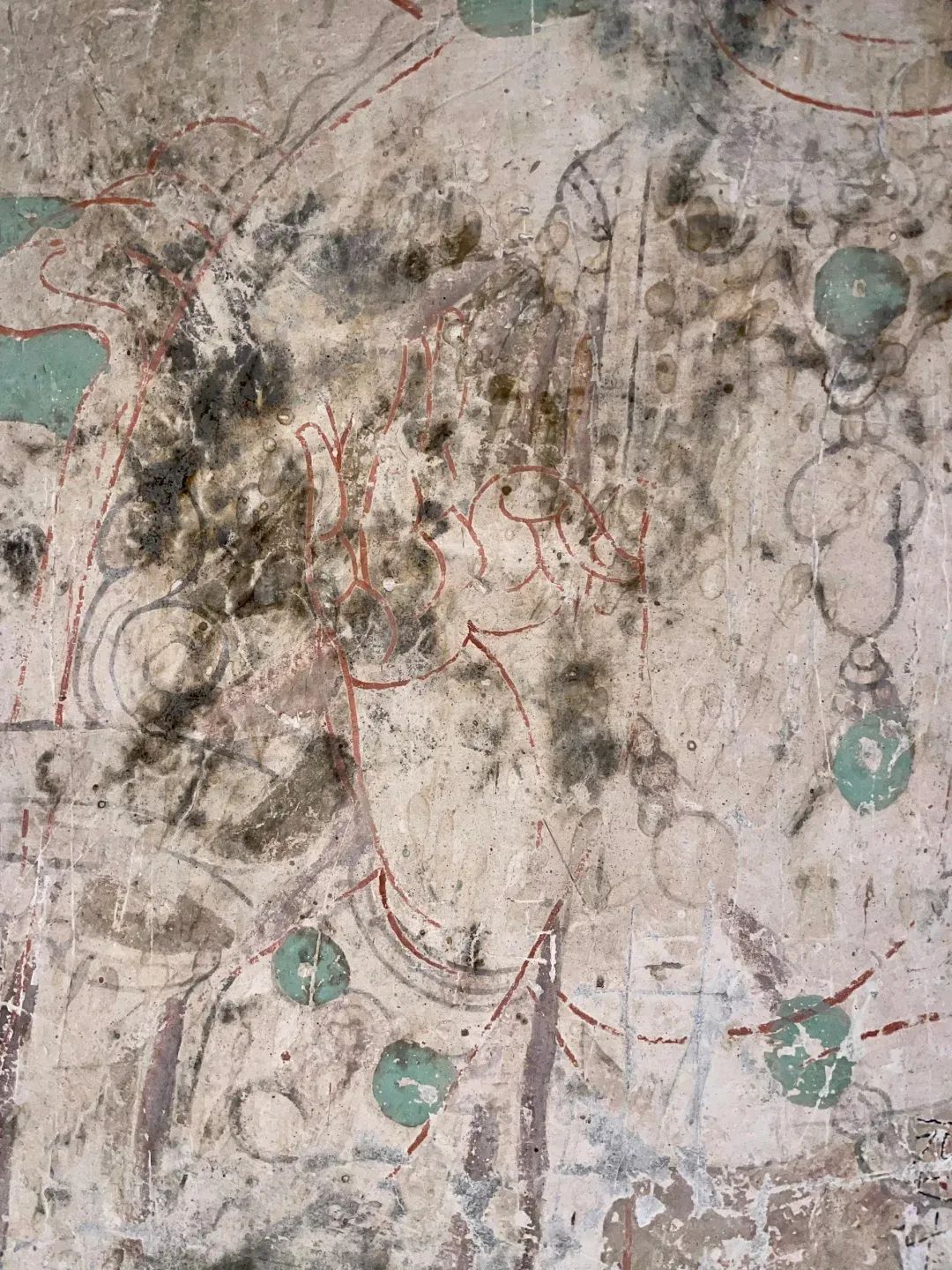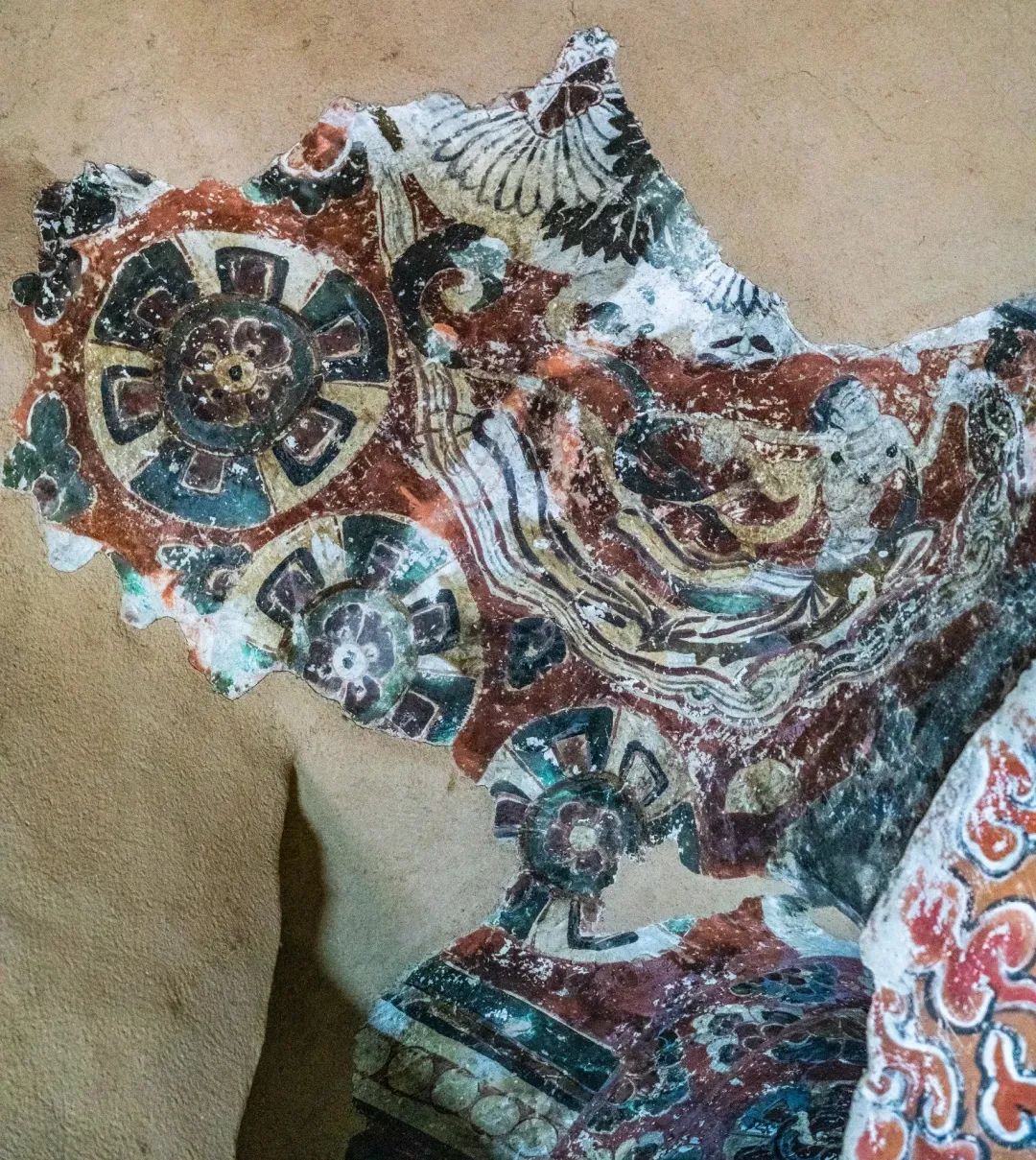 昌馬石窟第4窟洞窟形制及其殘存的塑像對(duì)于研究中國早期石窟藝術(shù)與佛教造像藝術(shù)極其重要。窟內(nèi)壁畫內(nèi)容是四壁上方畫條式旌幡,下畫供養(yǎng)菩薩,身高近2米,今殘存20身,菩薩周圍畫纏枝蓮,與第二窟基本相同??唔斍鞍氩康卣檀蟛糠置撀?,靠近中心柱正面上部右側(cè)的部位殘存龜形六瓣團(tuán)花圖案與一身飛天及菊花紋圖案。后部中心柱頂部周圍窟頂表面繪龜形六瓣團(tuán)花、連珠紋等圖案。