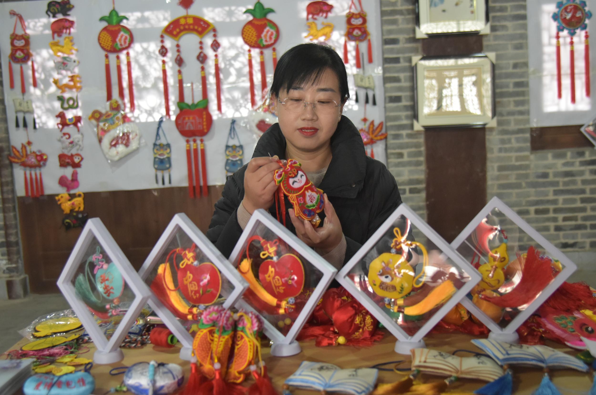 除了剪紙,鎮(zhèn)原縣香包、刺繡、書法等傳統(tǒng)文化藝術(shù)氛圍也很濃厚,深受廣大群眾喜愛。在文化一條街,十幾家書畫、香包、刺繡工作室緊挨,組成了一條文化長廊,除了銷售文創(chuàng)產(chǎn)品外,還承擔著非遺文化傳承和技藝培訓(xùn),熱鬧而又成氣候。“作為一名非遺傳承人,不僅要把自己的香包刺繡產(chǎn)品設(shè)計好、做精致,更重要的是要把這門技藝教給更多的人,讓香包、刺繡這門技藝更好地傳承下去。”慶陽香包刺繡非物質(zhì)文化遺產(chǎn)傳承人任艷艷說,自己在文化一條街已經(jīng)開店近十年了,帶出了很多巧媳婦巧婆婆,還不時受邀在縣內(nèi)外進行培訓(xùn)指導(dǎo)。