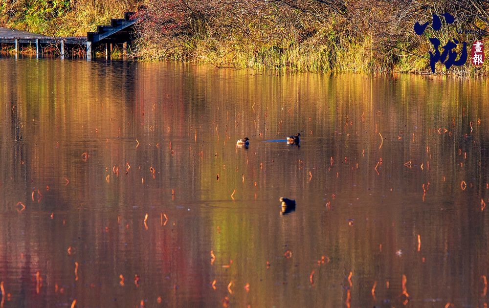 湫水深不可測(cè),湫池依偎在深林密樹(shù)旁邊,湫面蕩起縷縷波紋,浮光泛金,一群悠閑的野鴨在水面上游來(lái)游去?!?/p>
