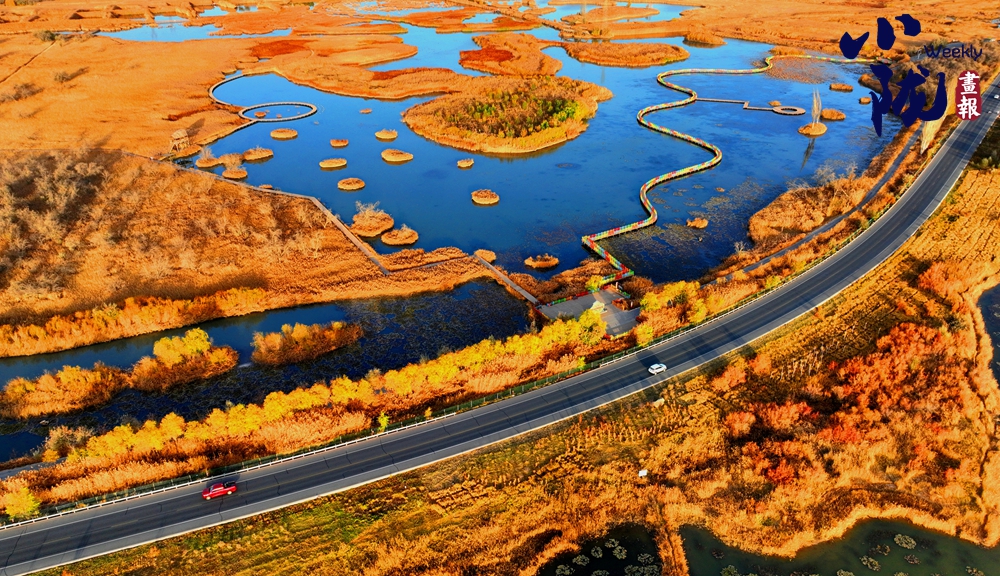 公路穿越濕地公園,蘆花舞動(dòng),碧水環(huán)繞,形成一條美麗的“金色大道”。